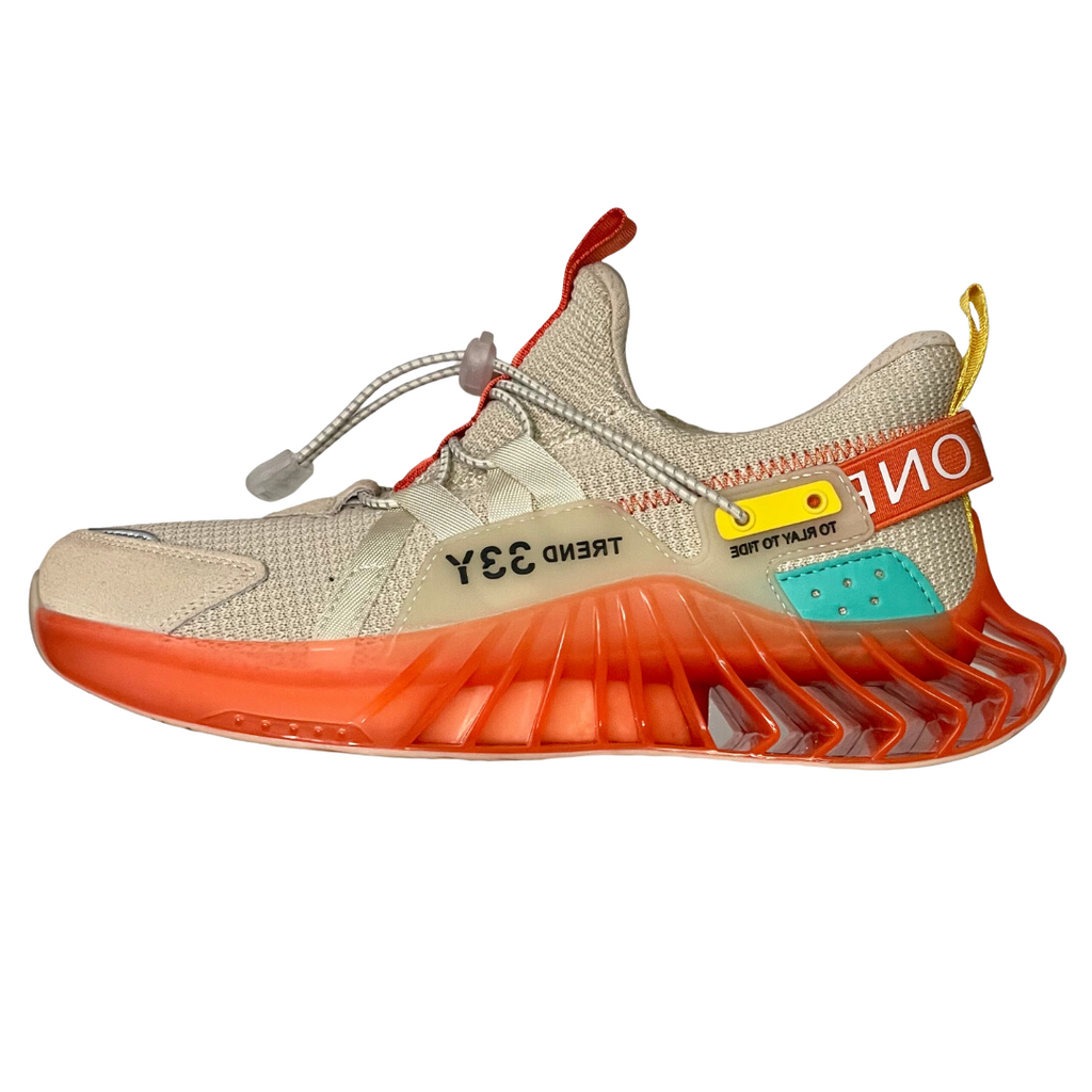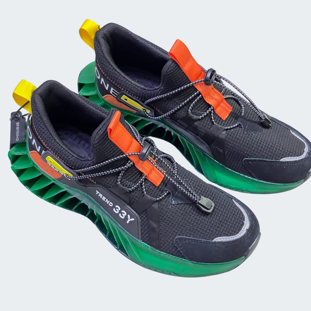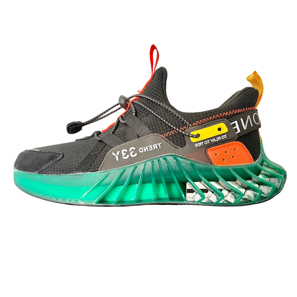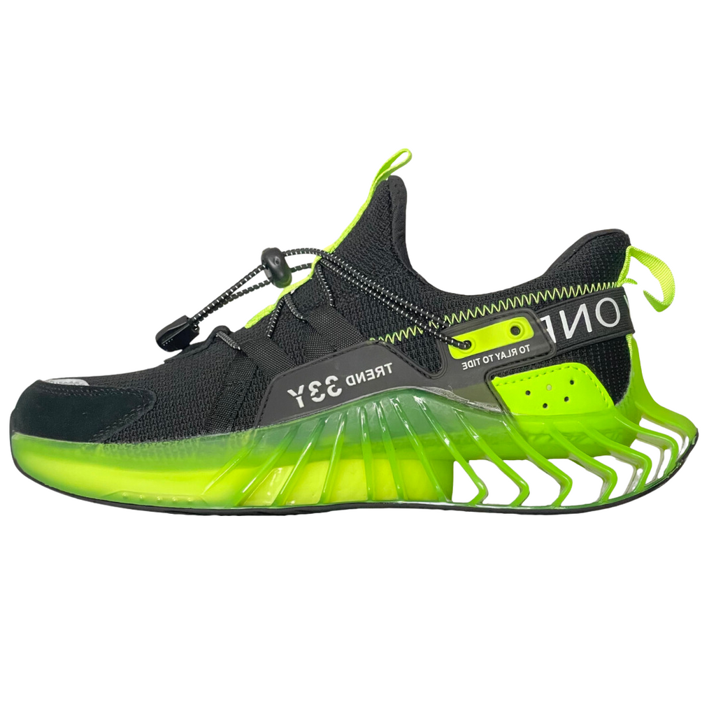O Tênis Comet Speed parece ter saído de um filme de ficção científica. Ele combina um cabedal preto em malha respirável com um espetacular solado translúcido em Verde Neon, criando um efeito visual "Glow" que chama atenção de longe. Além da estética agressiva com faixas e escritas ("TREND 33Y"), ele traz a praticidade do sistema de amarração rápida com regulador (toggle), dispensando o laço tradicional. Tudo isso em uma estrutura de 215g, equilibrando um visual robusto com leveza no caminhar.