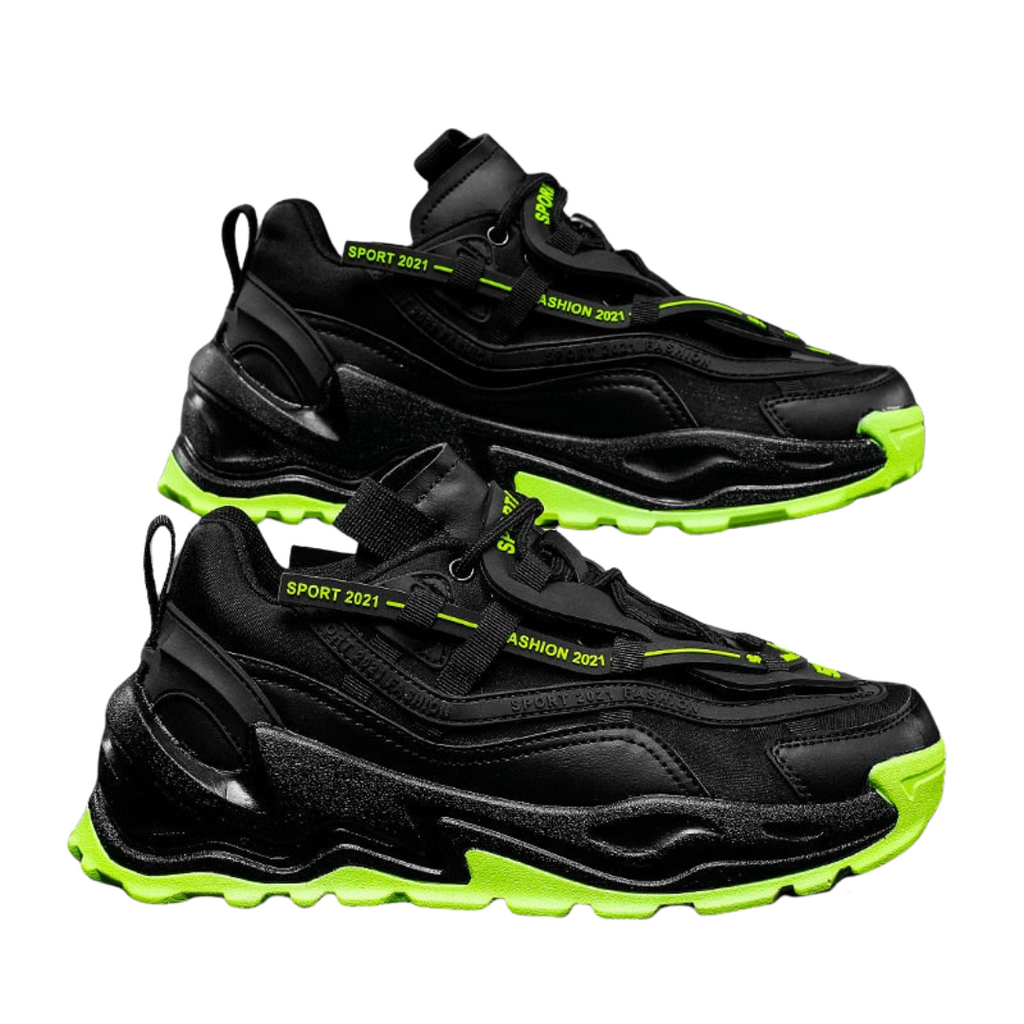 O Tênis Blaze Racer não foi feito para quem quer passar despercebido. Inspirado na estética techwear e na cultura urbana noturna, ele traz um design robusto e cheio de camadas, destacado pelo contraste elétrico entre o preto profundo e o solado verde neon. O mais impressionante? Tudo isso pesando apenas 220g.
