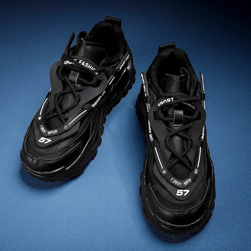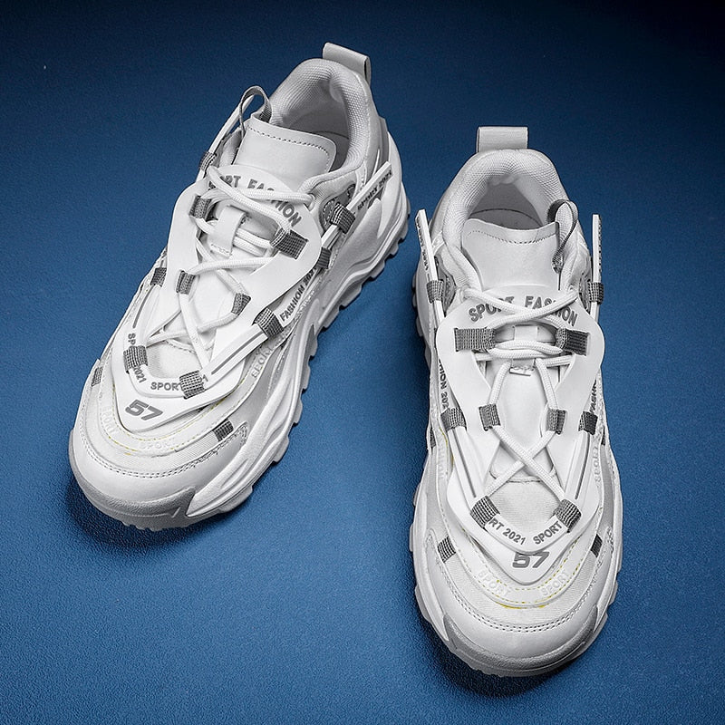 Estilo Cyber-Urbano: As fitas decorativas sobre o cadarço e o design ondulado do solado trazem uma estética futurista, perfeita para compor looks streetwear de impacto.